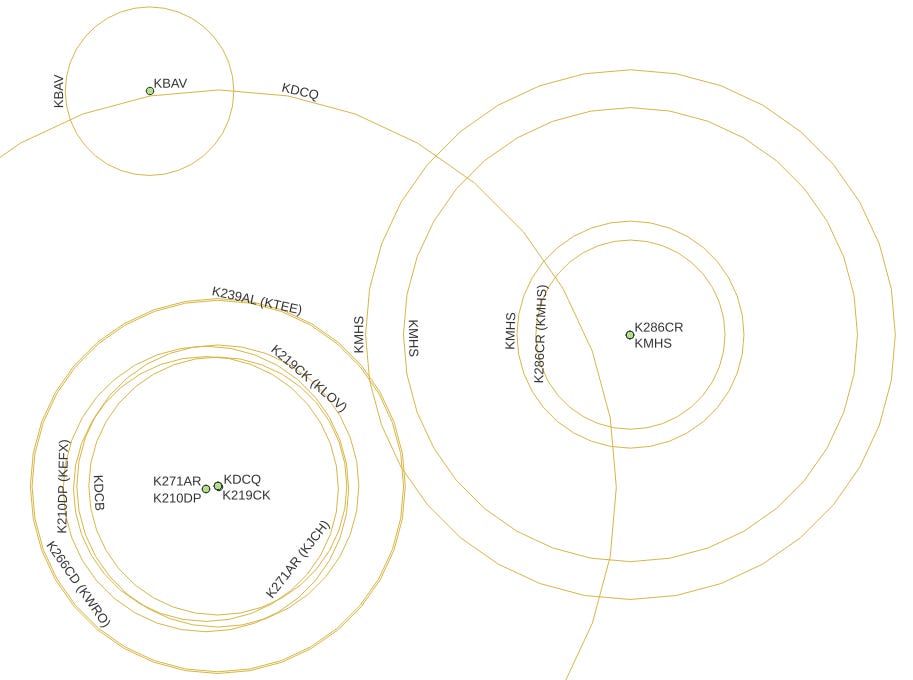 PROBLEM: I have a table of lat/lon values representing radio station data, including callsigns, transmitter locations, and estimated local transmission range in miles.